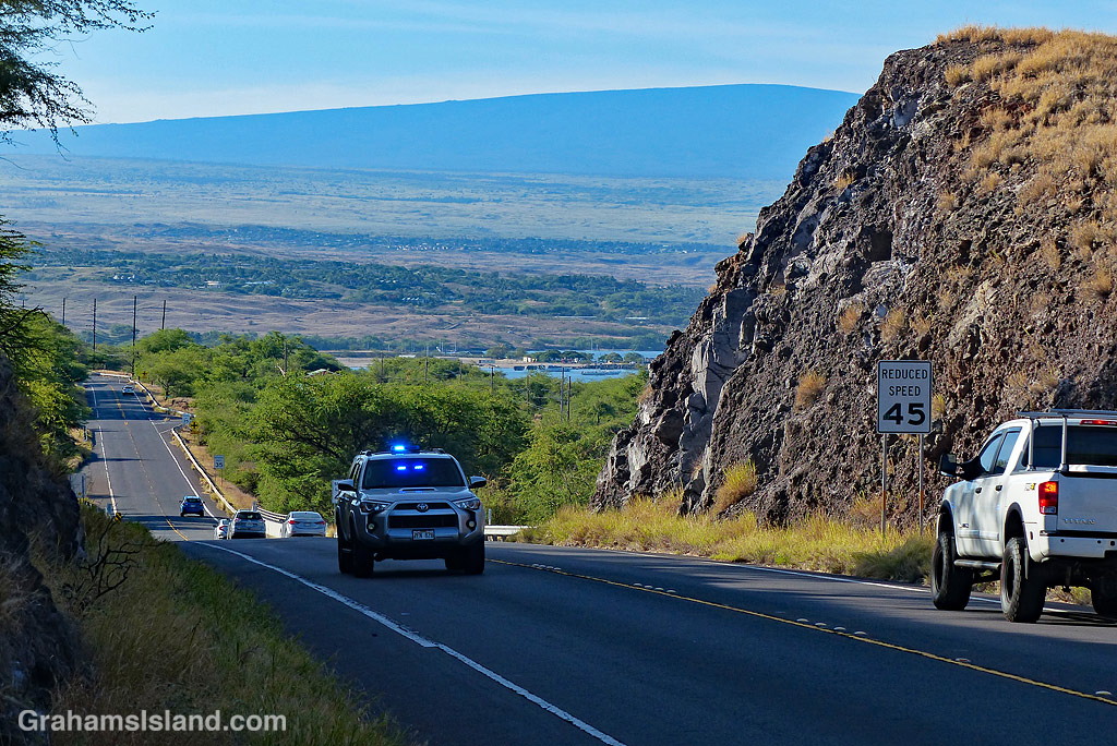 The truth is, driving 5 mph over the speed limit is generally considered acceptable here and won’t get you pulled over. Exceed that leeway and you’re taking a chance. And in Hawaii, the police are hard to spot. Most police officers drive their own cars with no markings and only a little blue light on top. When the police car in the bottom photo sped into view there was a blaze of brake lights from the vehicles heading down the hill. But it was on the way to some other, more important situation.