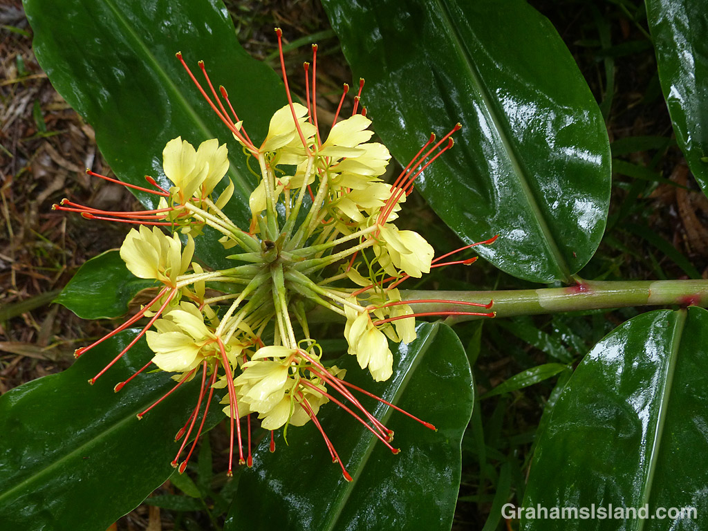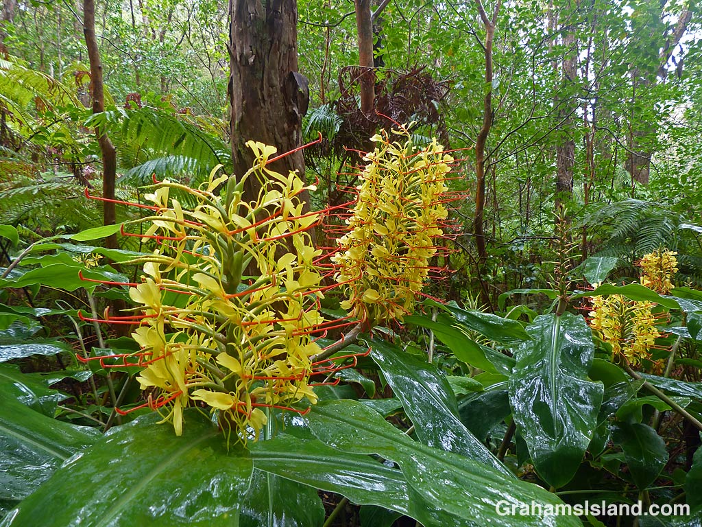 Kahili ginger (Hedychium gardnerianum), a native of the Himalayas, is a gorgeous plant, which puts forth a generous display of fragrant, showy flowers. Too bad then that another description for the plant is ‘invasive weed.’ It thrives in moist areas – pretty much anywhere on the east side of the island. Its rhizomes form dense mats, and crowd out native seedlings, and birds eat the fruit and spread the seeds.