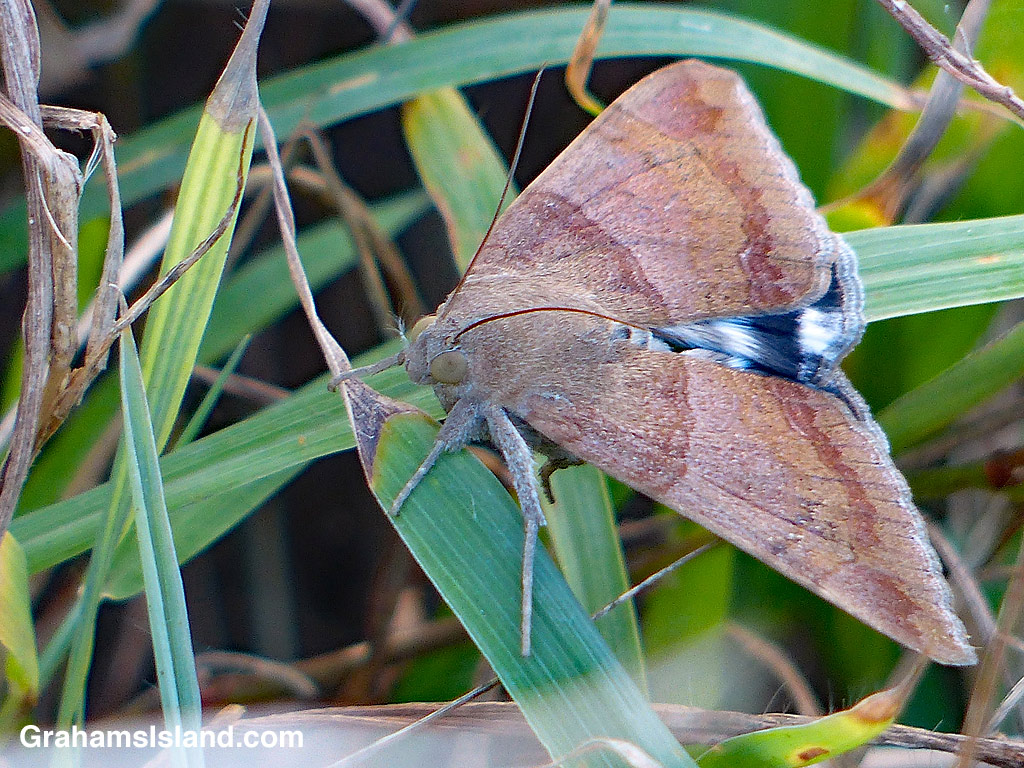 Also known as the castor-oil moth, castor-oil looper, and croton caterpillar, the achaea janata moth is most easily distinguished by the bold black and white markings on its hind wings.