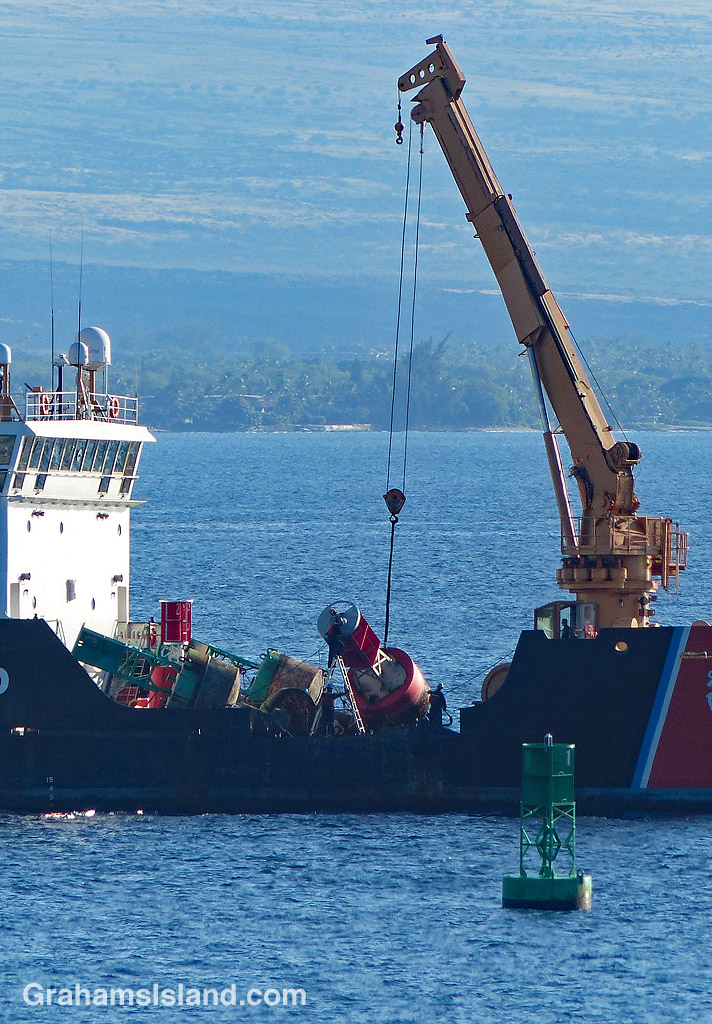 I saw this Coast Guard ship outside Kawaihae harbor. Here, it was hauling out one of the buoys marking the entrance to the harbor for inspection and maintenance. Buoys like this are commonly seen in coastal areas, in the vicinity of ports. They help guide ships into harbor, marking safe, deep channels or shoals to be avoided.