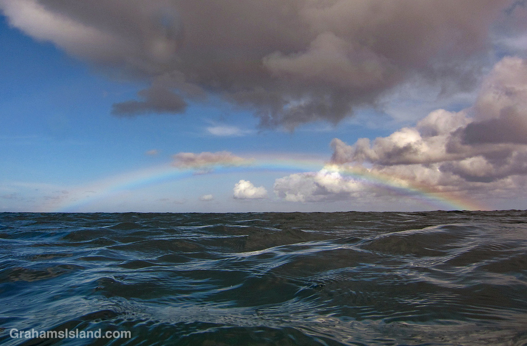 This rainbow occurred while I was snorkeling in somewhat lumpy water with clumps of clouds above.