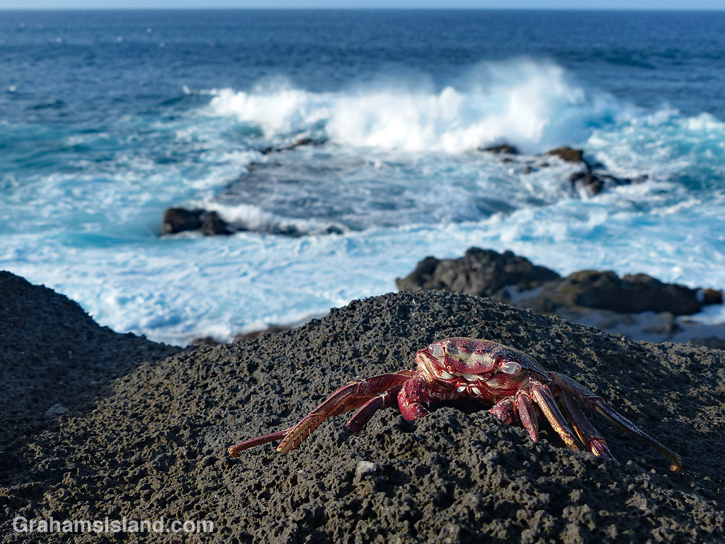 This is the molted shell of an a’ama crab, seen on the North Kohala shore. A’ama crabs are numerous around the Big Island and they scuttle away when disturbed. But while these crabs are black, their molted shells turn red in the sun, as this one has.