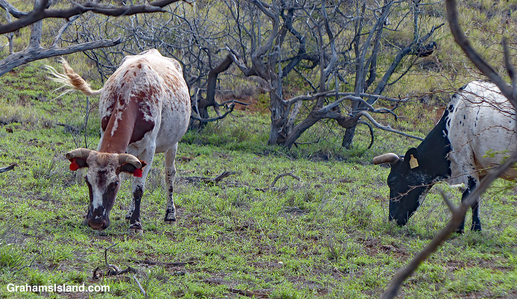 These are a couple of short-horned cattle, not shorthorn cattle which is an established breed of cattle. These two have had the ends of their horns removed. Unlike dehorning, when the entire horn is removed, removing only the tip is not supposed to be painful because that part of the horn is just keratin.