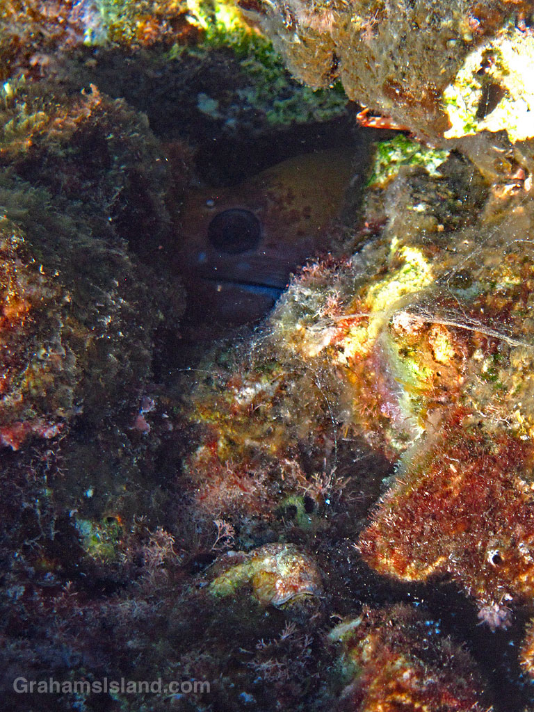 Recently though, I saw that the creature had turned around and, in the small opening, part of its head could be seen, revealing it to be a small yellowhead moray eel. In the photo, the eel’s eye peers out from its lair, which is surrounded by rock covered with different-colored growths.
