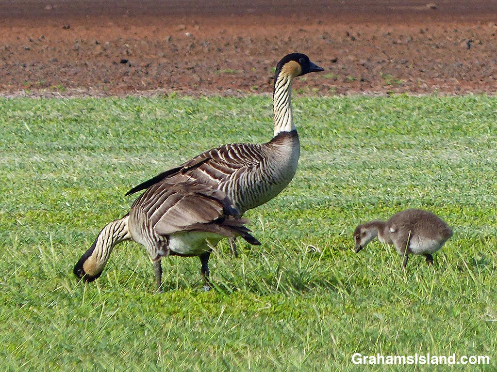 I’ve lived on the Big Island for more than seven years now, and I’ve seen lots of nene in that time. But until recently, I’d never seen a nene gosling. Then, a few weeks ago, I was driving and saw a pair of nenes with a gosling alongside the road. Alas, I couldn’t stop and take a photo at that time. I went back to the area later, but didn’t see the family again.