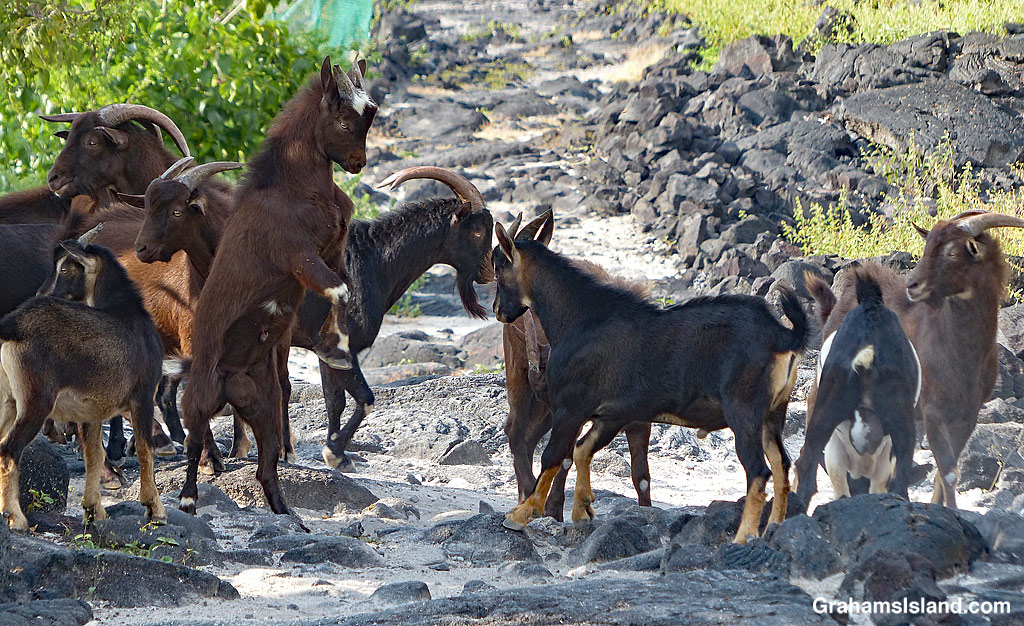 A herd of goats mill about on a trail in South Kona. In any sizable gathering of goats I usually see younger ones butting heads as they tussle with each other. This is practice for when they’re older and the jousts become a more serious contest for position within the group.