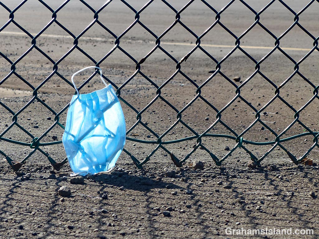 Sign of the times A discarded or dropped face mask is pinned to a fence by the wind, probably not an unusual sight these days. Like Loading...
