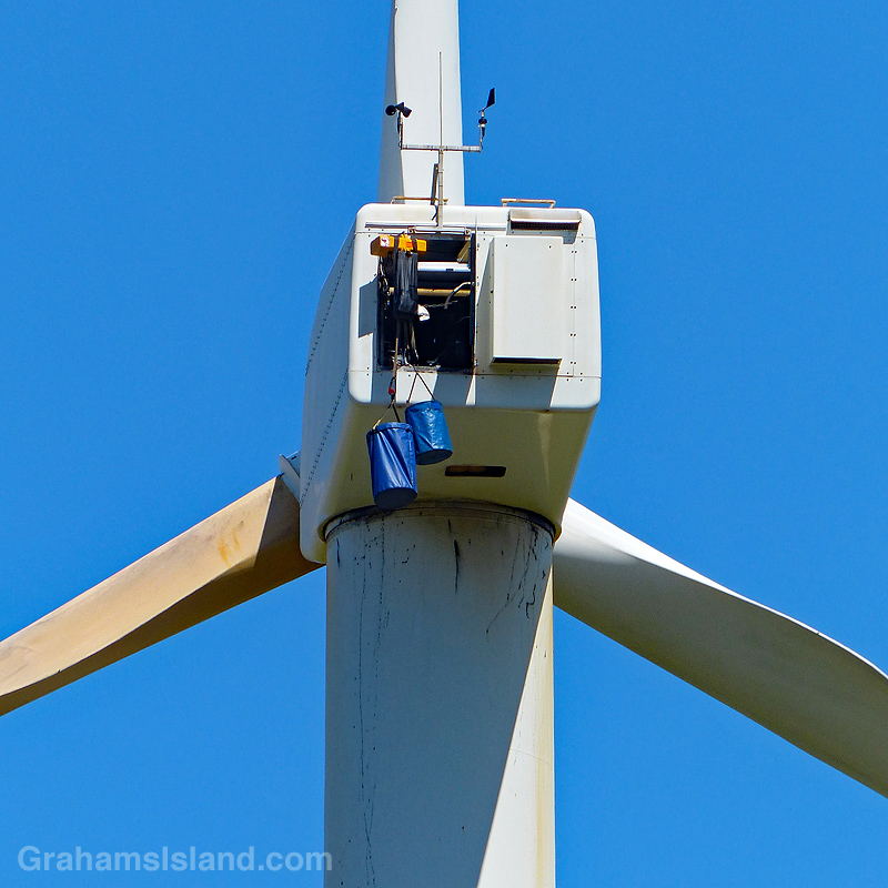 At the top of wind turbine towers is a small room containing the machinery and electronics for the unit. Once in a while, I’ll see the door open and a couple or three blue bags hanging from a cable. Sometimes I can make out the technician inside, checking things out and performing routine maintenance.