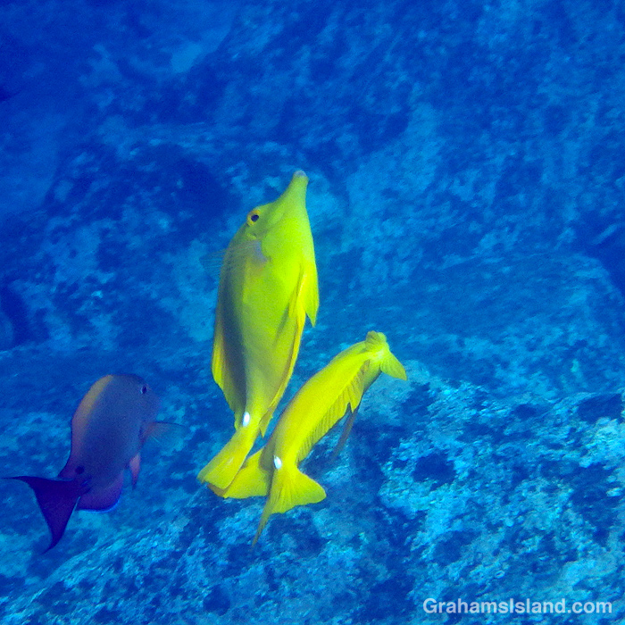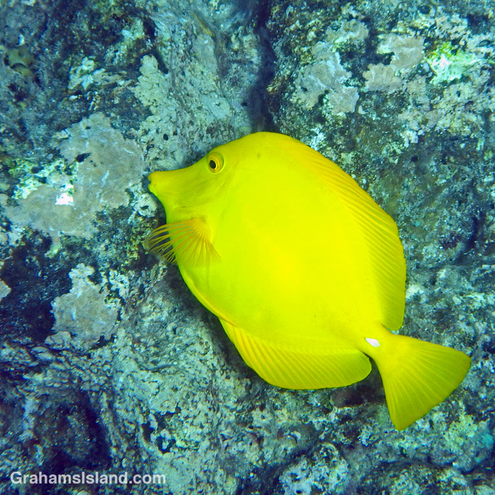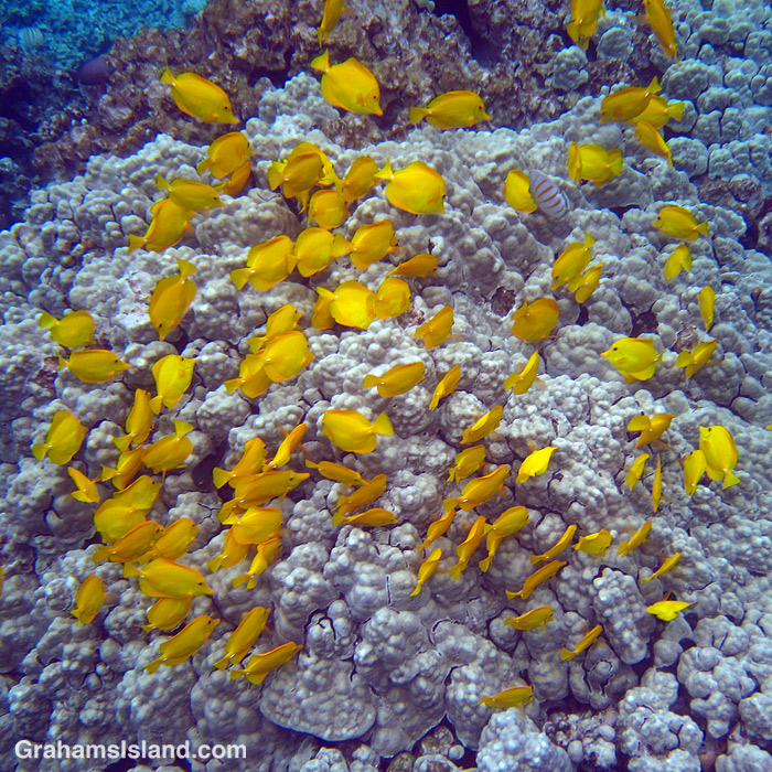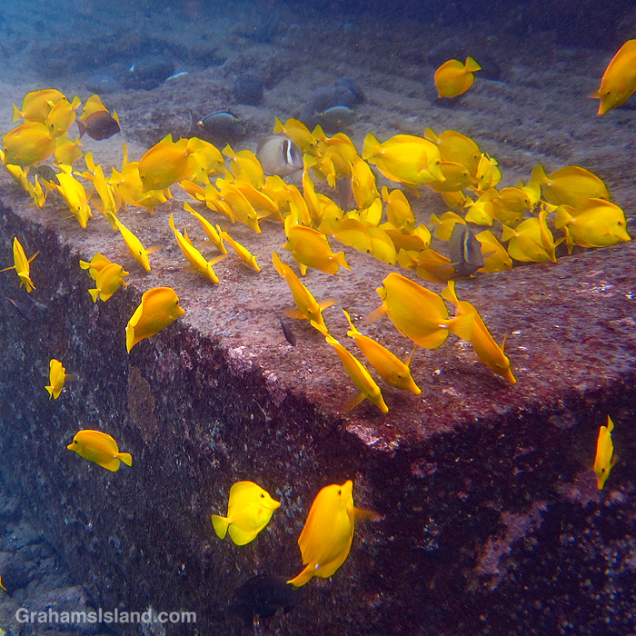 Yellow tang are long-lived fish. They can live to be 20 or 30 years old. They’re also fish that are very popular in the aquarium trade but, since they don’t breed in captivity, all aquarium fish are collected from the wild. Currently, there’s a moratorium on the aquarium fish collection trade here, because of concerns about fish stocks and the sustainability of the practice.