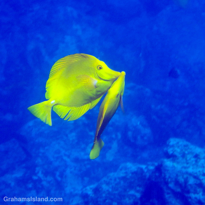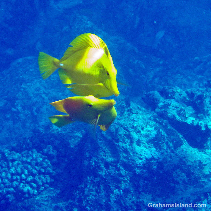 I thought I’d try the WordPress gallery feature for this post, which features yellow tangs, the first fish everyone notices in Hawaii. These bright yellow fish putter about in fairly shallow water, sometimes singly or in pairs, but often in large groups. They feed on algae, and occasionally can be seen cleaning turtles for this purpose. Unlike some fish, juveniles look the same as mature yellow tangs so shoals often contain a variety of sizes. The lower three photos show a pair of yellow tangs engaged in what I think is some kind of mating ritual.