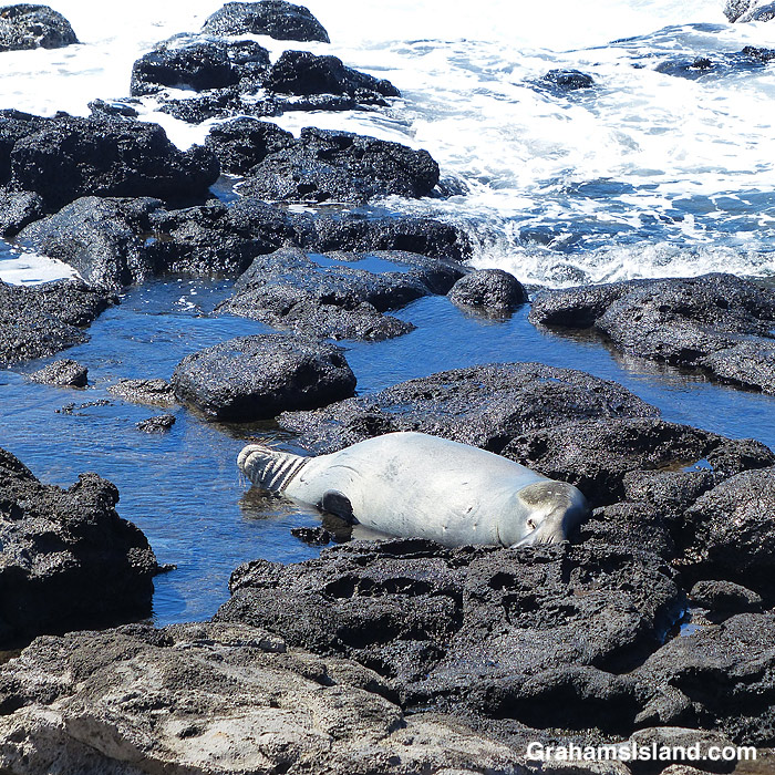 Monk seals molt about once a year and it is a process that can take 10 days or so. During this time the seal will generally remain on the beach or rocks where it has hauled out.