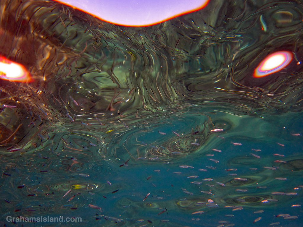 Recently, I’ve been taking photos of shoals of little fish I see when I get in the water. I thought I’d try shooting them from underneath and, while this hasn’t resulted in decent fish photos, I rather like the look of the water that’s shown up in some of the photos. This one has the added bonus that even the fish can be seen, too.