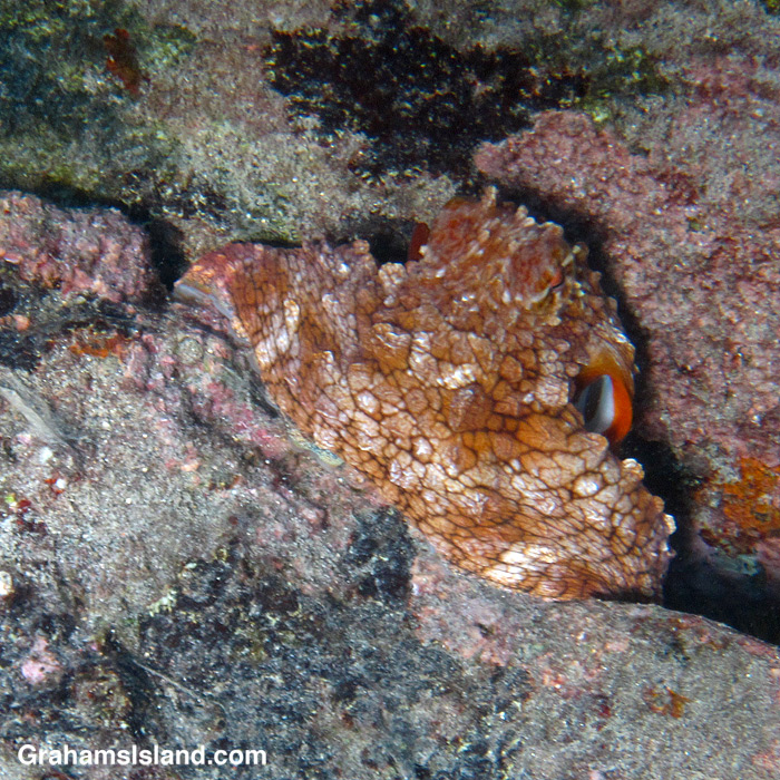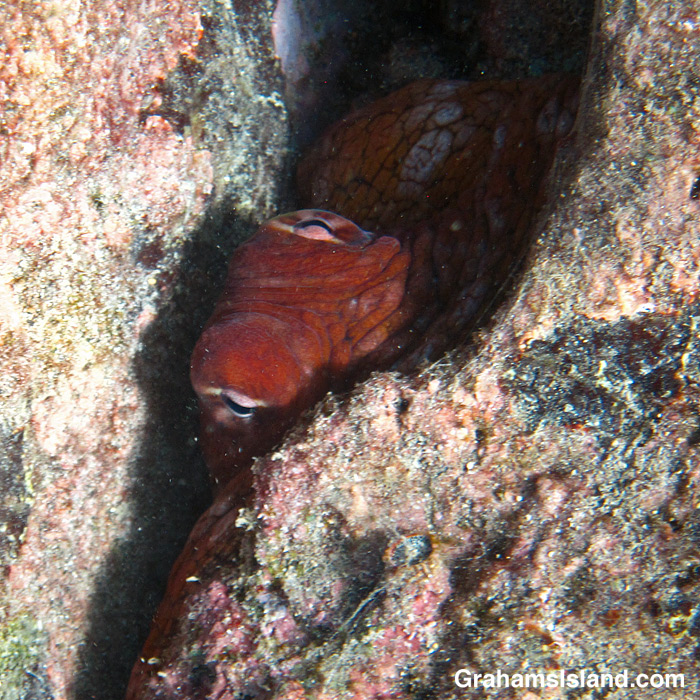 I was almost done with my swim yesterday when I noticed this small day octopus sneaking into this crack. It was shallow there so I got a decent photo of the octopus watching me. Then I swam on a few feet. The octopus, as they do, emerged from its hideaway, so I quickly turned and got the second photo. I can be kind of sneaky, too.