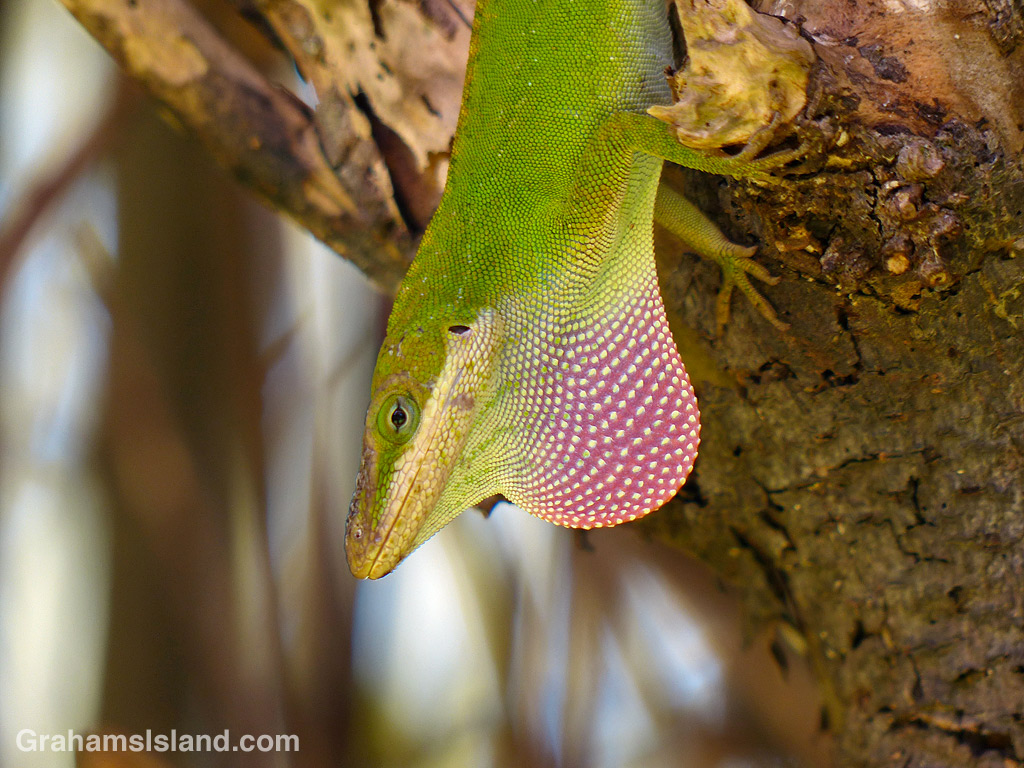 A green anole defends its territory in a hedge from an encroaching photographer. A typical display involves a lot of head bobbing and extending of the anole’s dewlap. If the intruder is another anole, the defender might rush the other one, though in my experience, they rarely end up fighting.