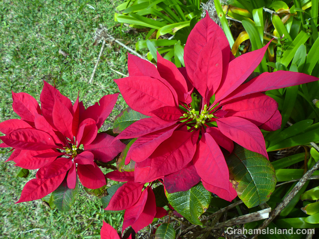The red ‘flowers’ are actually bracts, which hold the fairly insignificant flowers. On the Big Island, their brilliant displays are quite common on the west side of the island, where they can be seen as bushes and trees.