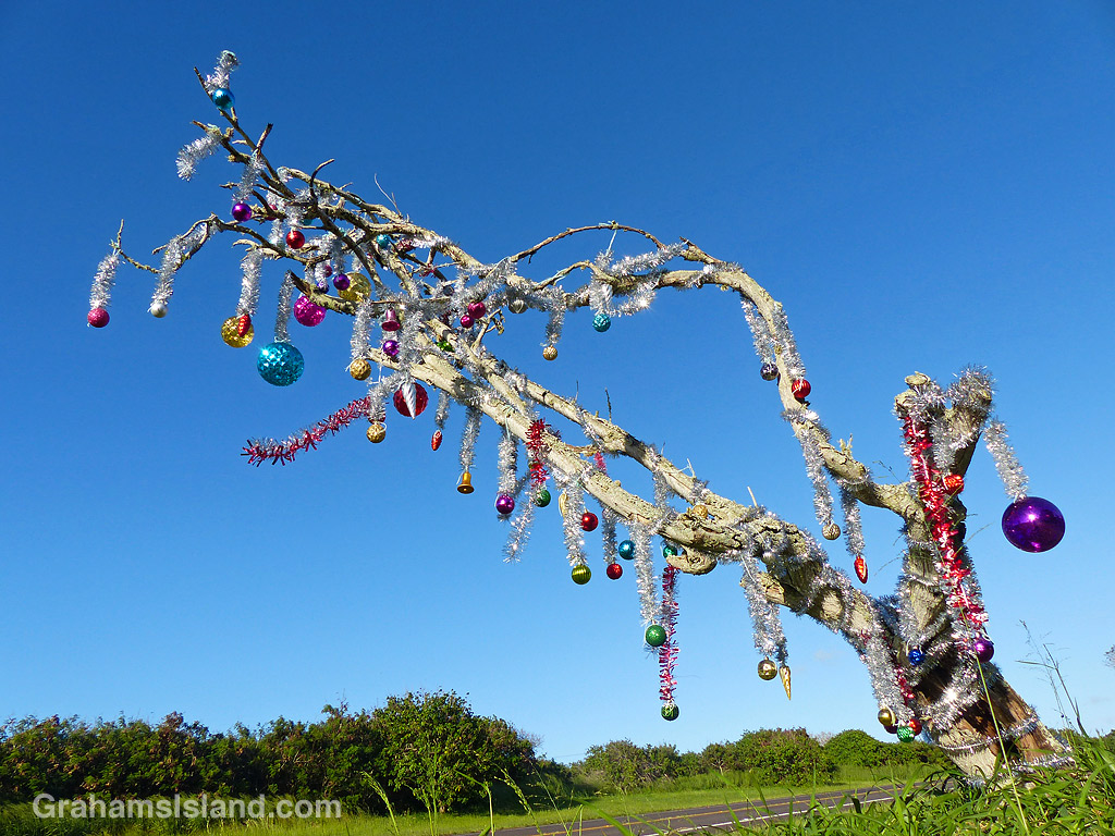 A week or so ago, I saw a small group of people decorating this dead tree alongside the main highway a couple of miles shy of Hawi. Lavished with tinsel and ornaments, it might be this tree’s last hurrah in the world, but what a way to go!