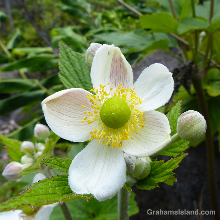 Japanese anemone (Anemone hupehensis) is a native of China and Taiwan. This one was growing on the edge of Halemaʻumaʻu Crater, where the current eruption of Kilauea Volcano is taking place.