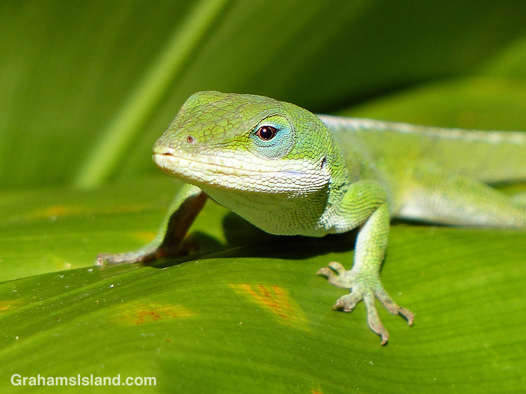 Green anoles often look a bit rough on the top of their noses, but this one was particularly rough and white in that area. In addition, while it has assumed brown coloration, a patch of green refused to go away. One or both of these conditions might be related to shedding, but it could be something entirely different.