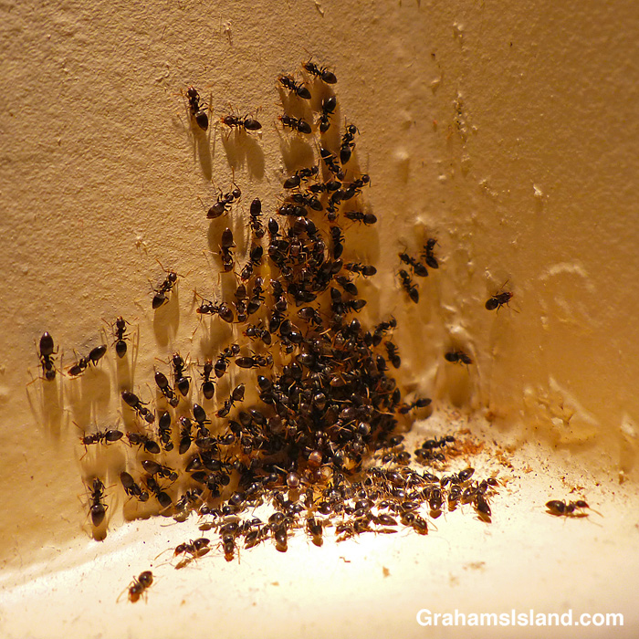 Each sac can contain up to 300 eggs. The eggs are encased in foam, called ootheca, which hardens into the sacs seen here. The sac in the middle photo was crawling with ants, which I suspect is not good news for the would-be mantises inside.