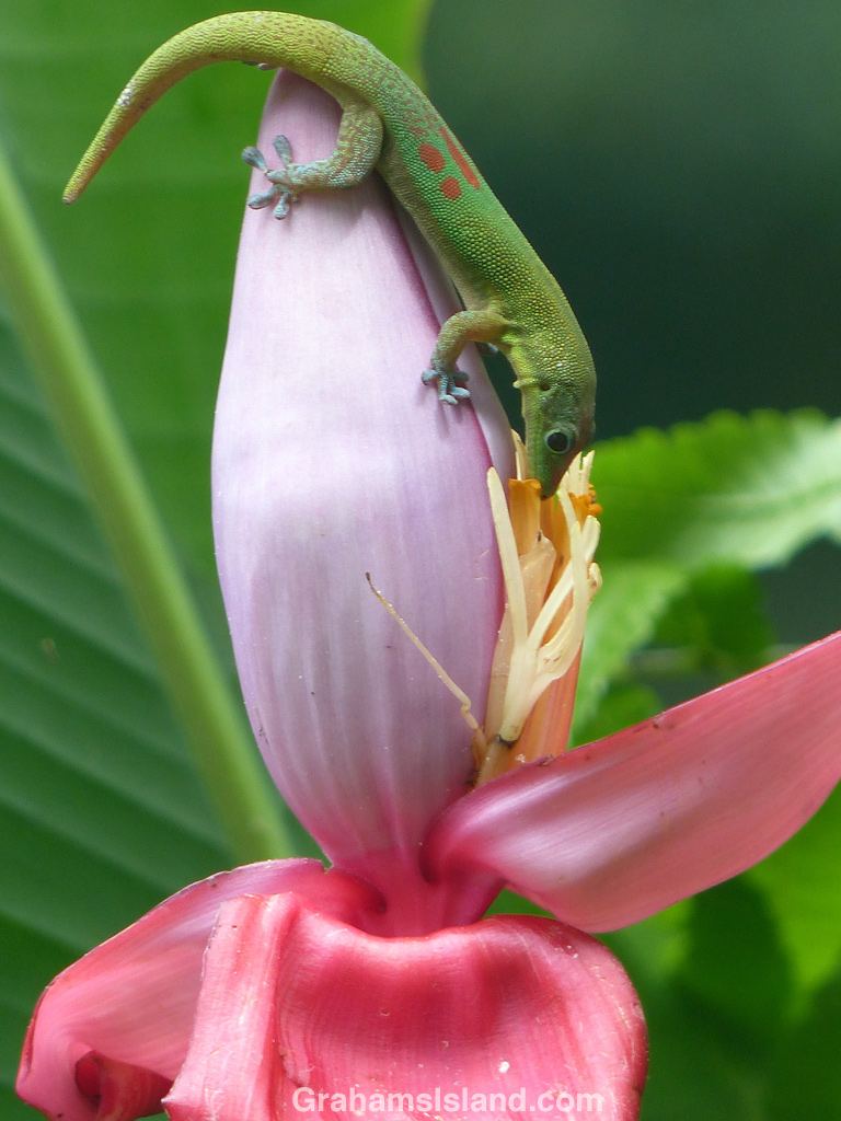Finally, there’s a pink banana hosting a visitor, a gold dust day gecko after a little something to drink.