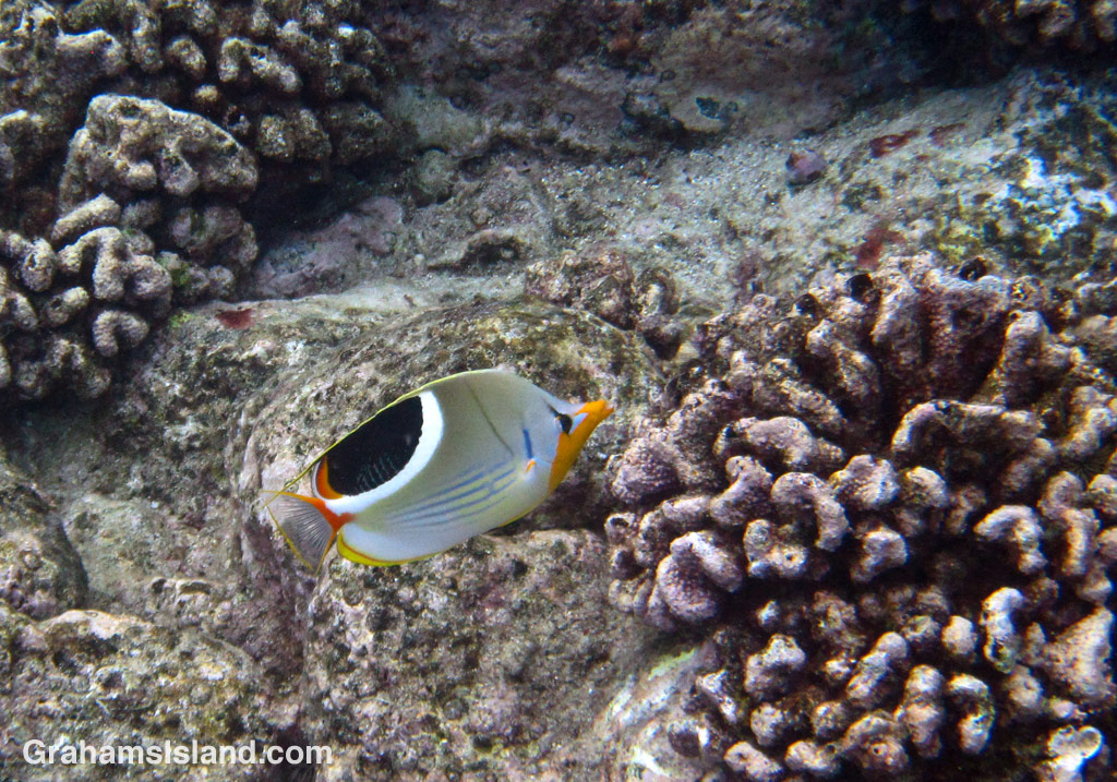 Most butterflyfish have some sort of eye camouflage, so the bluestripe butterflyfish is unusual in having none. The diagonal blue stripes also make it stand out from the crowd. And where most butterflyfish have relatives in the Pacific, the nearest relative of the endemic bluestripe butteflyfish, is the east coast of Africa