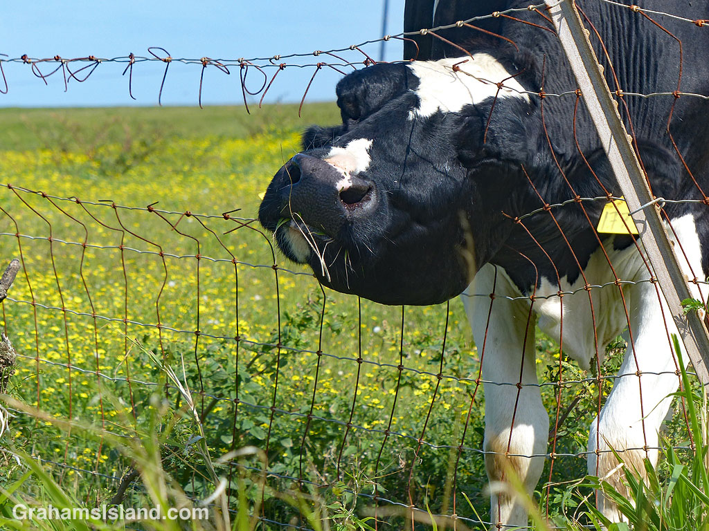 This young bull gave me a watchful look as I took photos over a flimsy-looking fence, but it quickly lost interest in me, and returned to grazing. Check out those flies!