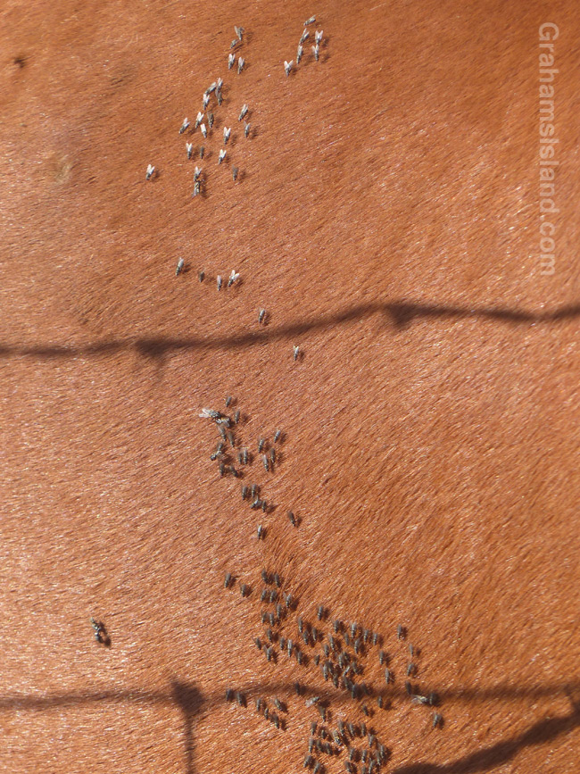 I don’t know what the fish were, but they were likely juveniles of one of the pelagic species. They were very small, a half to three quarters of an inch long. The clump of line itself was only 6 to 9 inches across. But such environments provide valuable shelter for a variety of tiny creatures. It was only when I looked at the photos that I noticed another one, the small orange crab on one of the lines.