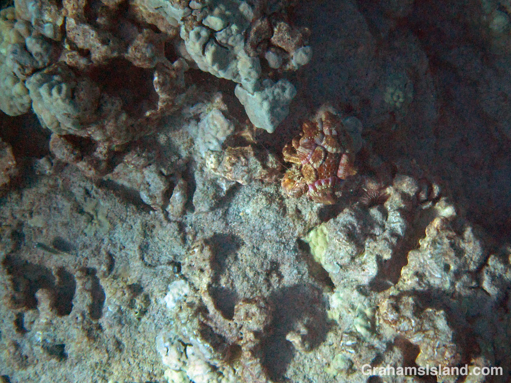 I spotted activity in a head of coral and thought I’d found another batch of Isabelle’s Hermit Crabs (here). But even as I took photos, I thought the color of the legs wasn’t quite right. This proved to be the case. Instead, these are Painted Hermit Crabs, a species endemic to Hawaii. The shells occupied here are probably from one of the marine snails known as drupes, Grape Morulas being a possibility.