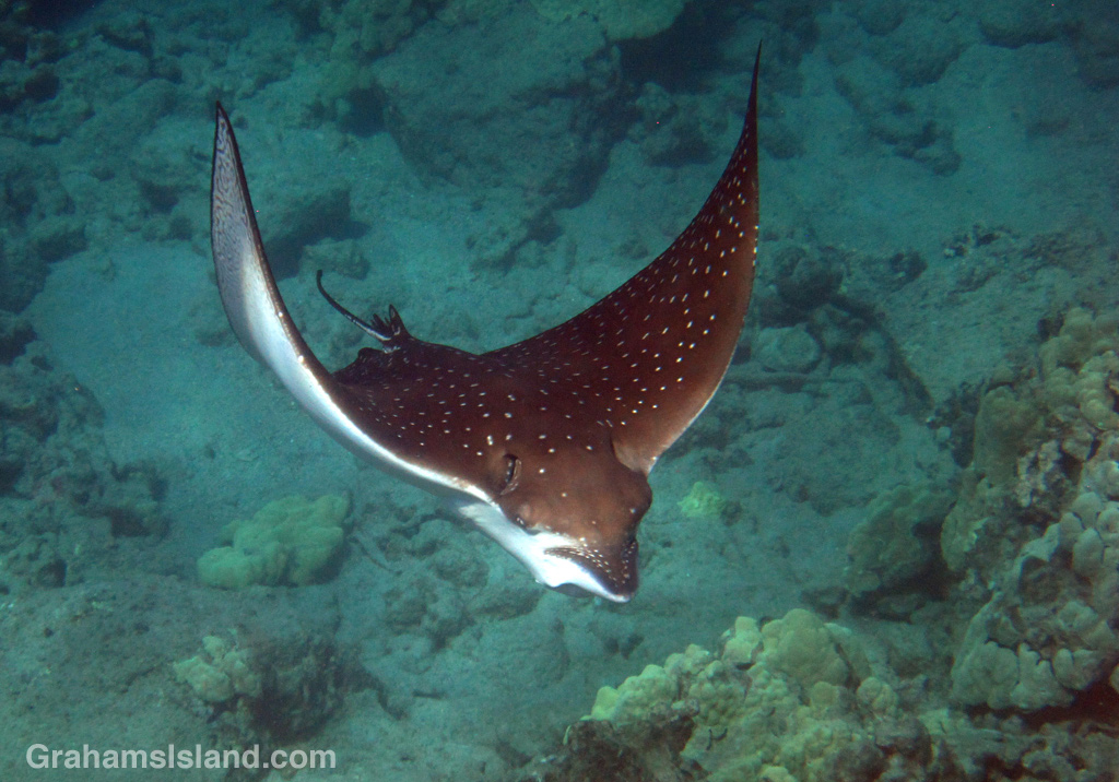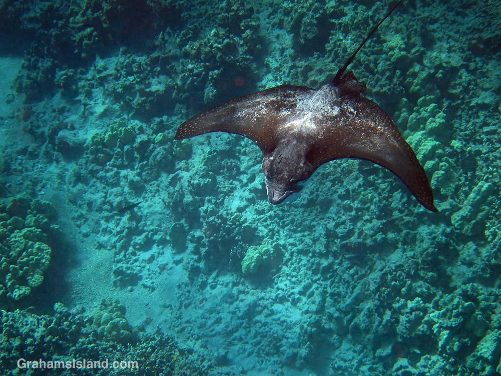 Sadly, I saw one such example recently. I hadn’t seen an eagle ray in a while, so I was excited to see this one. But it’s progress seemed a bit odd and I quickly realized that it was, unwillingly, towing some kind of marine debris. It looked like an old net or something similar, on the end of a loop of line that had become hooked over the beak of the ray.
