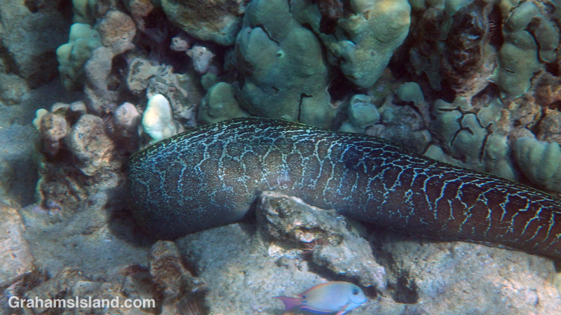 I saw this large undulated moray eel cruising in shallow water until it disappeared into, what appeared to me to be a tiny crack in the coral. John P. Hoover says of the undulated moray eel, “One of the commonest Indo-Pacific morays, it is also one of the nastiest; do not attempt to play with it or feed it.” Words to live by.