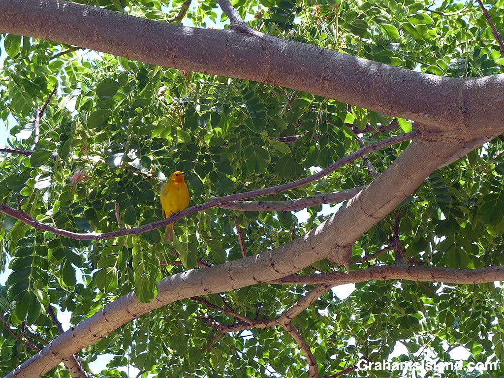 Monkeypod trees are renowned for their spread, creating large shady areas below. They also provide habitat for many birds including this saffron finch, enjoying a rest in the relative cool of the lower branches.