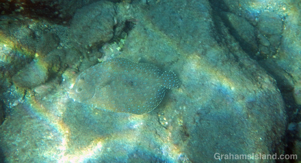 A small flowery flounder passes over what I think are patches of lobe coral. Those two bumps casting shadows on the top of the fish are the flounder’s eyes, which sit on the end of small stalks. As you can see in the photo, the two eyes are pointing in different directions. This isn’t a case of wandering eyes; they work independently.
