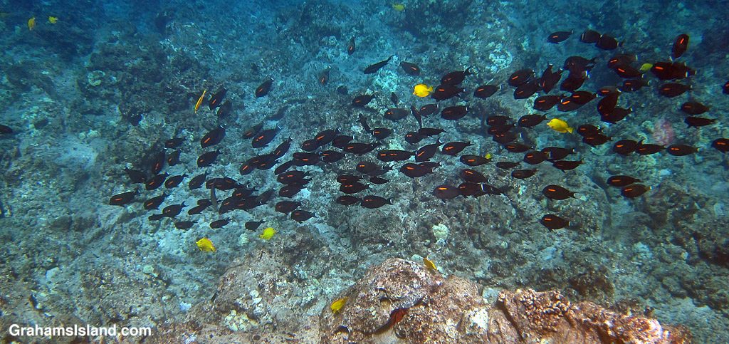 A shoal of orangeband surgeonfish is fun to see with their orange bands making them easy to identify and follow. For the purpose of this challenge, I took the photo below, desaturated the other colors, then boosted the orange to emphasize their defining feature. These changes virtually eliminated the other fish, particularly the yellow tang which went from bright focal points to almost invisible.