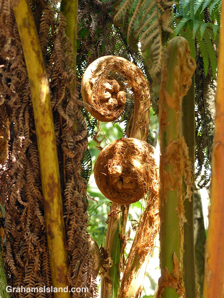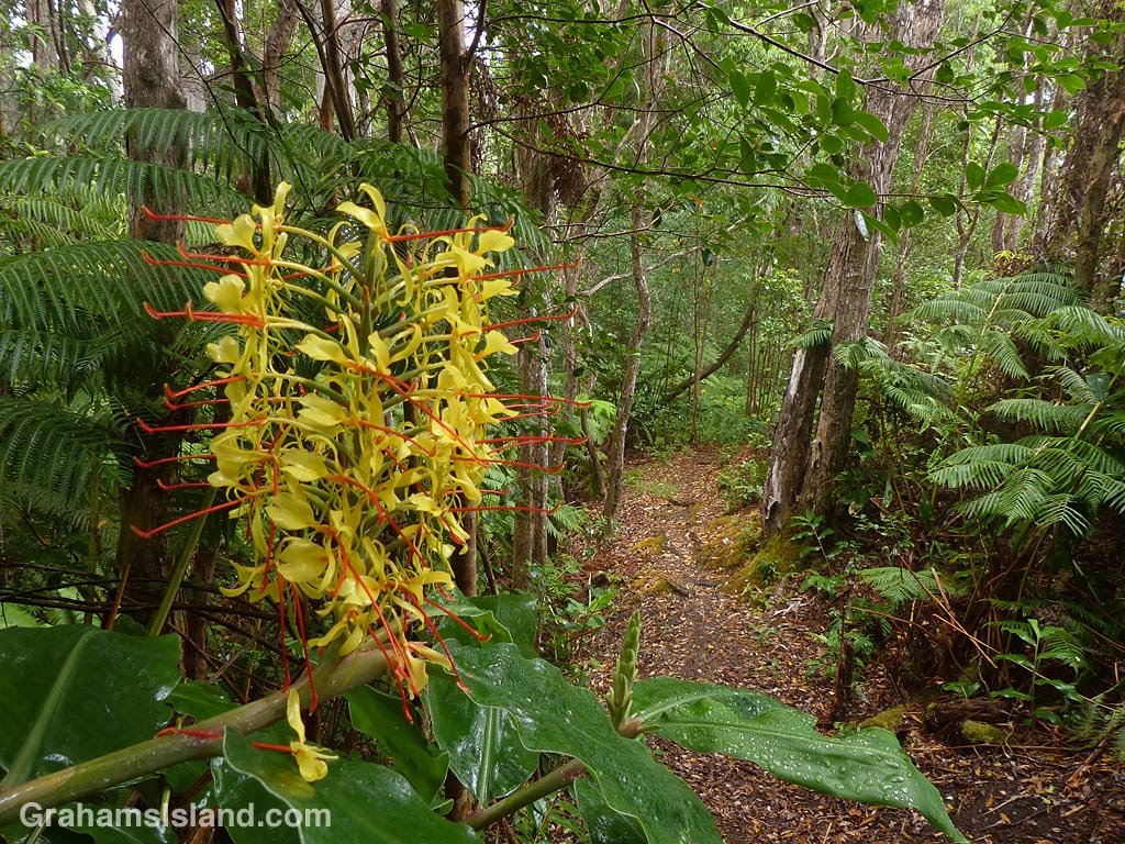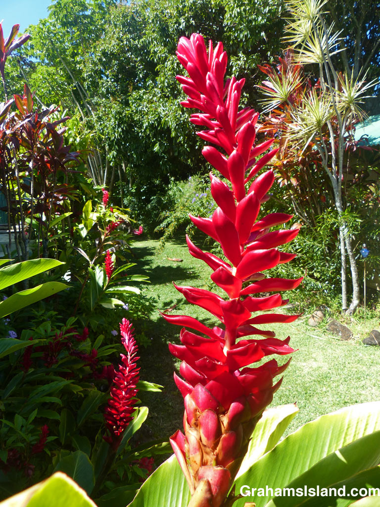 A Gold Dust Day Gecko shows impressive flexibility next to a Torch Ginger at Hawaii Tropical Bioreserve and Gardens.