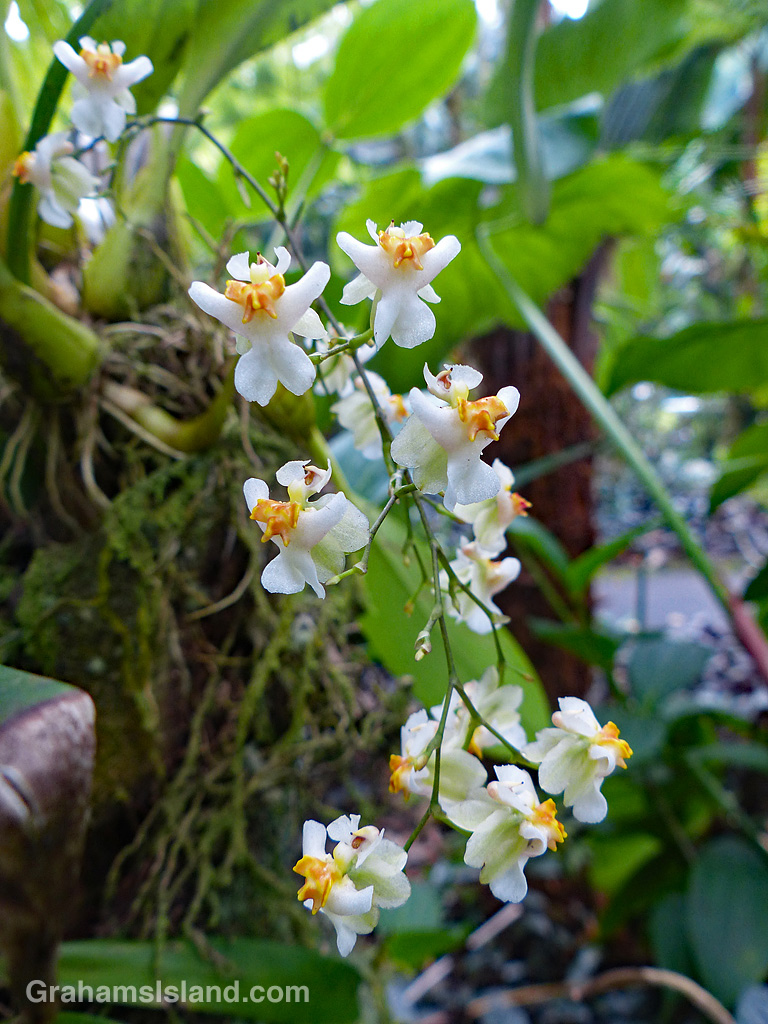 Leopard orchids (Grammatophyllum scriptum) come from the low-lying coastal areas of Southeast Asia. They produce abundant, showy flowers, but can grow to be quite large. Because of this growth habit, they’re most often seen in botanical gardens rather than domestic gardens.