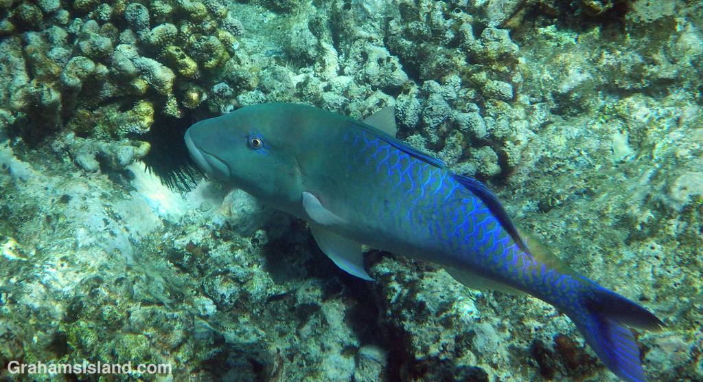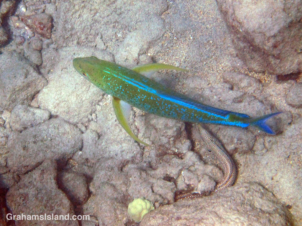 A couple of views of different bluefin trevallies. There are two things I particularly I like about this quite large fish. One is that they’re quite beautiful when the sun catches their blue markings. The other is that they tend to hunt in twos and threes, often times in the company of goatfish, and an eel or octopus. Indeed, if you want to see an octopus, one of the best ways is to watch for trevallies, especially if they’re just stooging around in one area for no apparent reason. In that case, it’s probably because there’s an eel or octopus present that can’t easily be seen.