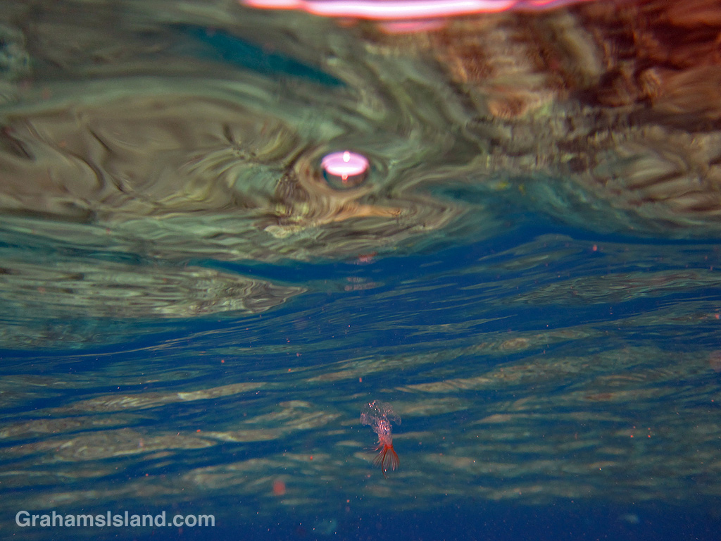 This was the best photo I got, but I liked how the water swirled around above it with the pink-rimmed hole looking like it might just have beamed the jellyfish down.