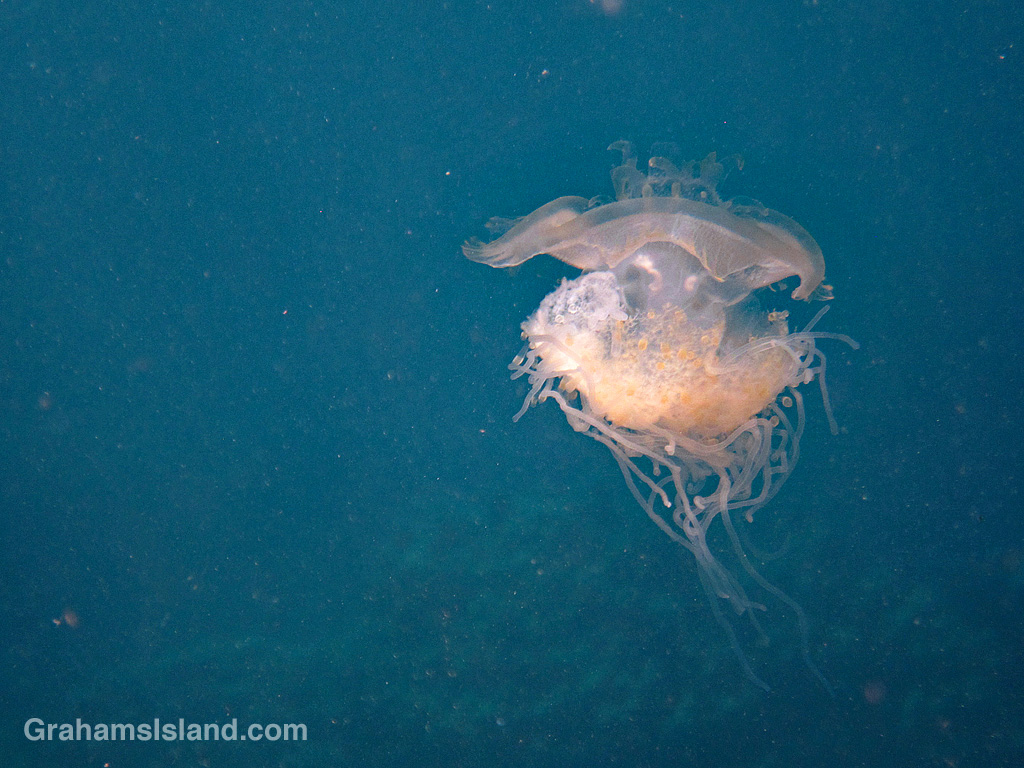 Conditions weren’t great during a recent swim. Their were ocean swells and an onshore wind made the water choppy. The visibility was only fair, with a lot of coral polyps, the little dots in the photo. But then, literally out of the blue, I saw this crowned or crown jellyfish (Cephea cephea).