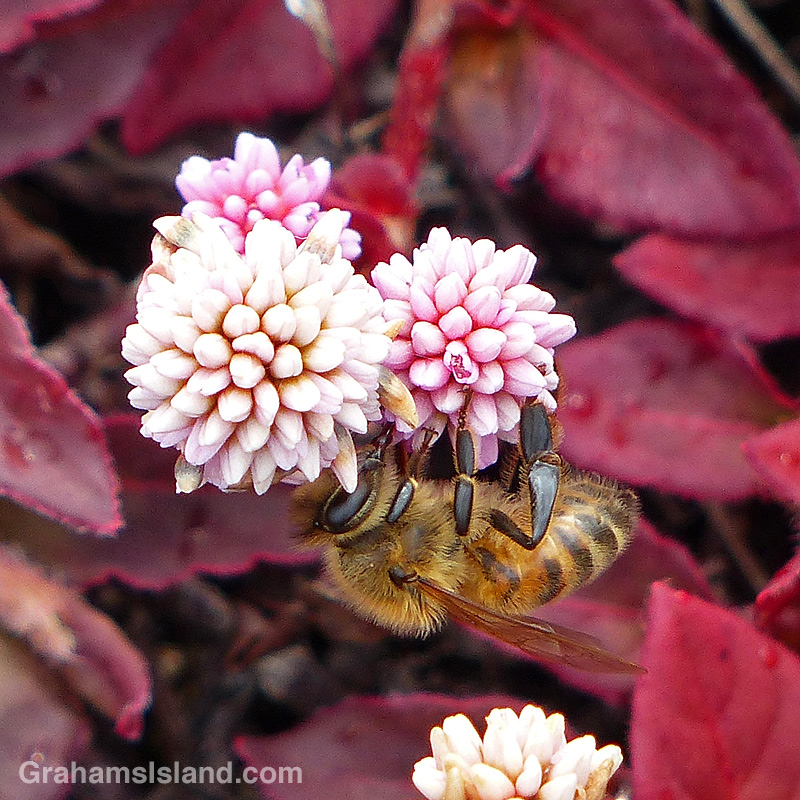 Pinkhead smartweed (Polygonum capitatum or Persicaria capitata) is a groundcover that hails from western China and the Himalayas. It’s variously known as pinkhead knotweed, pink knotweed, Japanese knotweed, pink-headed persicaria, or pink bubble persicaria. I use pinkhead smartweed for the very good reason that I like the name. It sounds like the name of someone pretentious, but slightly seedy, from the alleged upper crust of society.