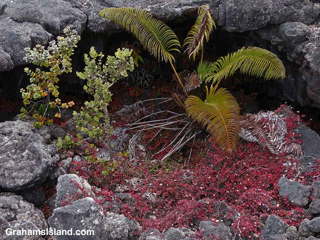 The top photo shows the rugged kind of ground pinkhead smartweed can grow in. To the right, bees appreciate the flowers of this plant growing at an elevation over 5,000 feet. Below, the collapse of a lava tube has left a shady hole where pinkhead smartweed, an endemic amaumau fern, and an ohia tree have established a good foothold.