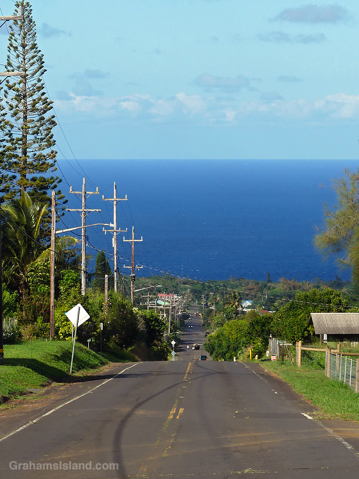 The view from the top of Kynnersley Road in Kapaau. Alas, it does not reach the sea, though there are ways to access the shore along that stretch of coast.