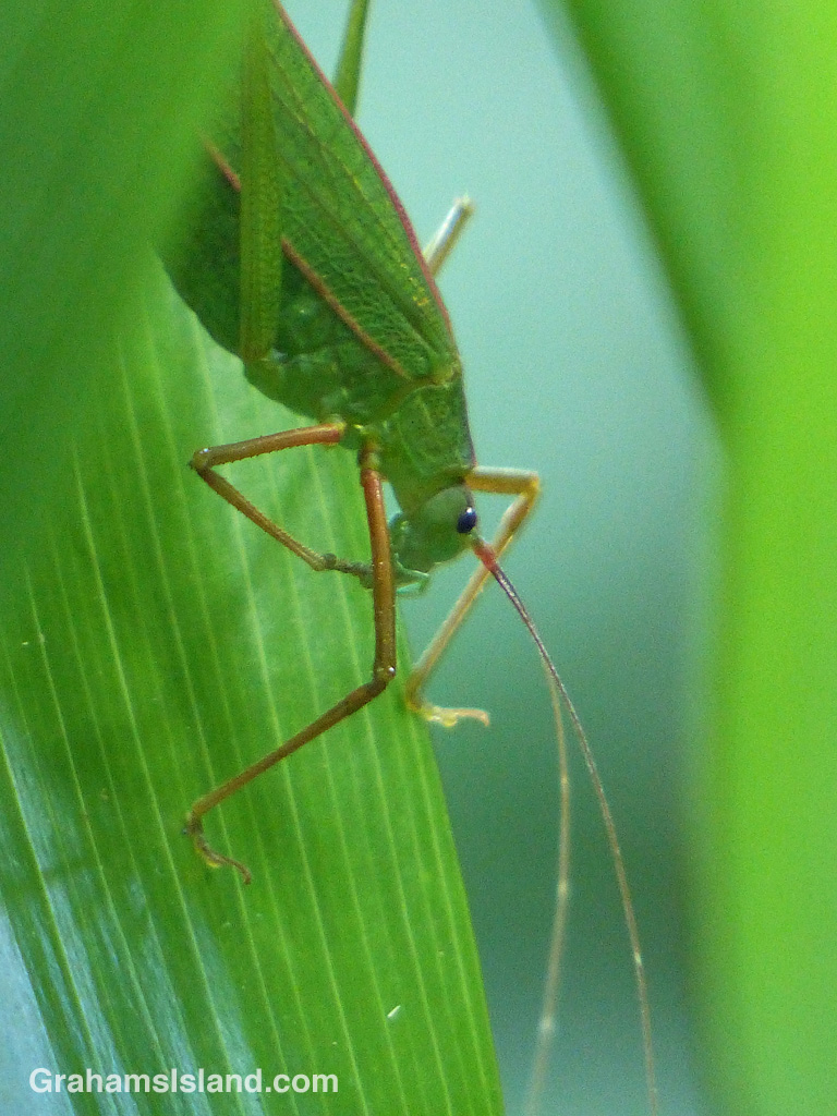 A katydid waits on the corner of the lanai, its stick-like legs at odd angles, appearing broken in the middle. But if I get too close it will ping away, as those same legs rocket it to safety.