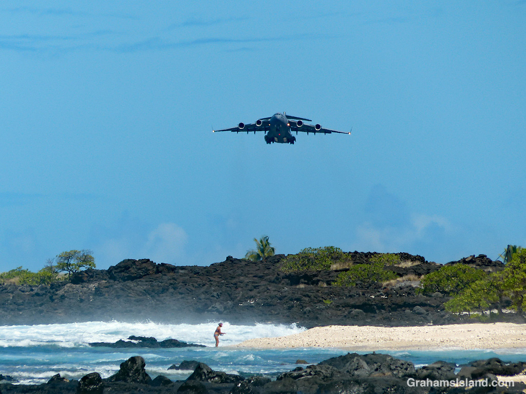 If there’s a downside to the park, it’s that it’s just south of the airport. It’s not O’Hare, but planes come and go with some regularity. It’s also used by the military and planes, such as this big C-17 transport, practice touch-and-goes with some frequency. So it’s not the most relaxing beach on the island, that’s for sure, but with white sand, blue water, and hot sunshine, it has a lot going for it.
