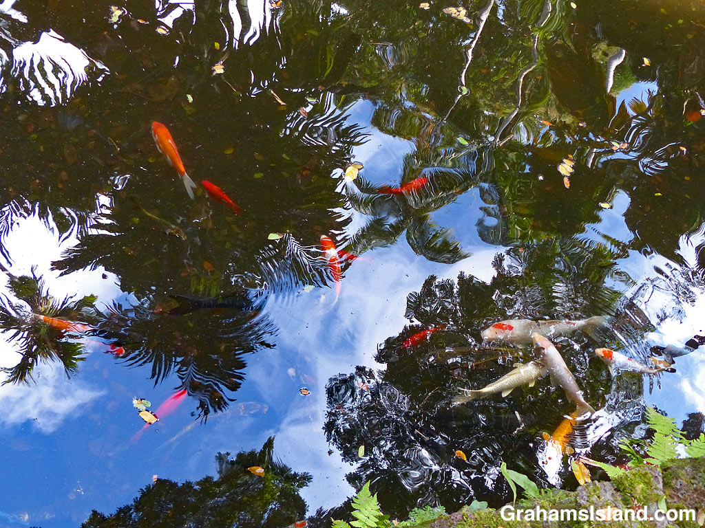 Lily Lake, in the grounds of Hawaii Tropical Botanical Garden, is a tranquil spot which I particularly enjoy for the reflections it provides. On my last visit, the koi in the lake made an appearance and added to the spectacle. As I moved back and forth, on the walkway alongside the lake, the koi followed, clearly hoping I was about to throw a little food their way.