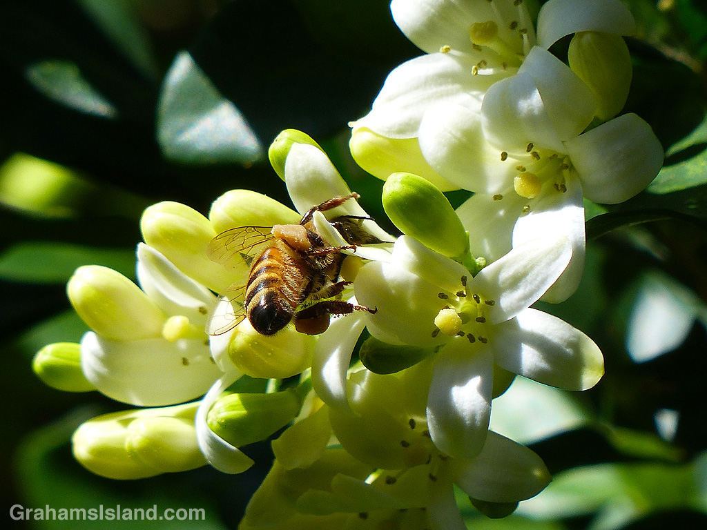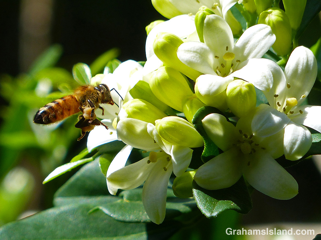 Three or four times a year, the mock orange in the yard comes into bloom with a prolific show of small, white flowers and wonderful fragrance. During these times it’s a bee magnet and the whole tree buzzes from morning to night.