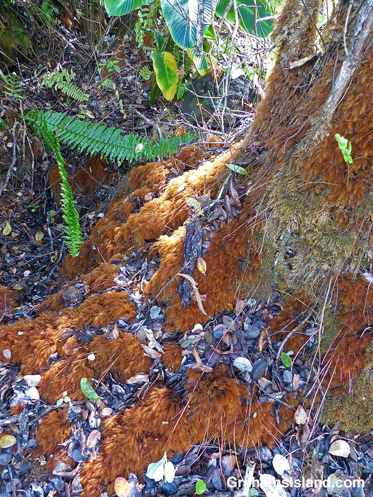 Moss growing on the roots of what I think is a Brazilian Firetree (Schizolobium parahyba), growing at Hawaii Tropical Botanical Garden.