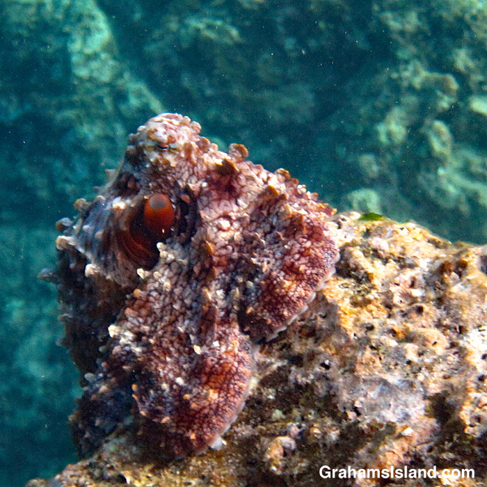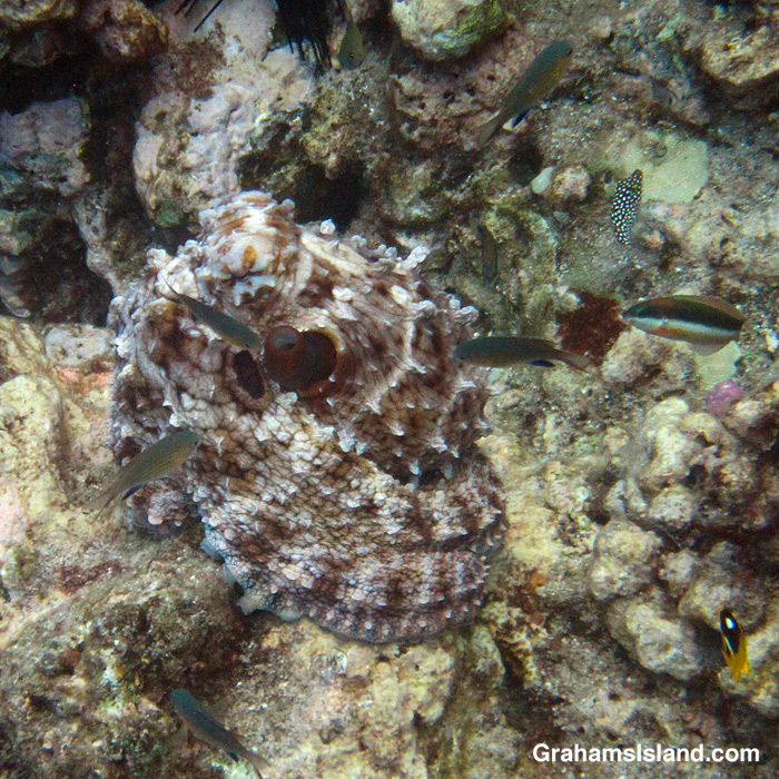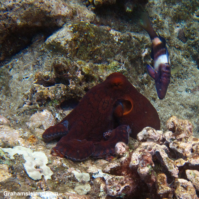 Octopus is a popular food in Hawaii and has long been so. If I’ve learned to look for goatfish as an indicator of their presence, then no doubt spear fishermen have too. These days, if I see an octopus when anyone’s spear fishing nearby, I don’t do anything to draw attention to it.