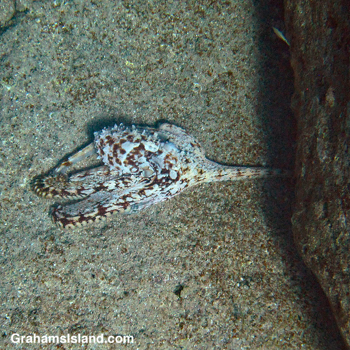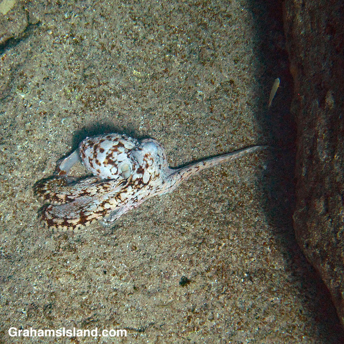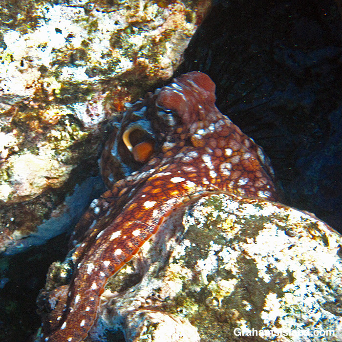 I swam over a rocky ledge and saw an octopus in the middle of a large, flat rock. The rock was pale, but speckled and the octopus was quite white with brown markings. When an octopus gets angry it will flush white, but that wasn’t what was happening with this one. Its paleness was an attempt to blend in.