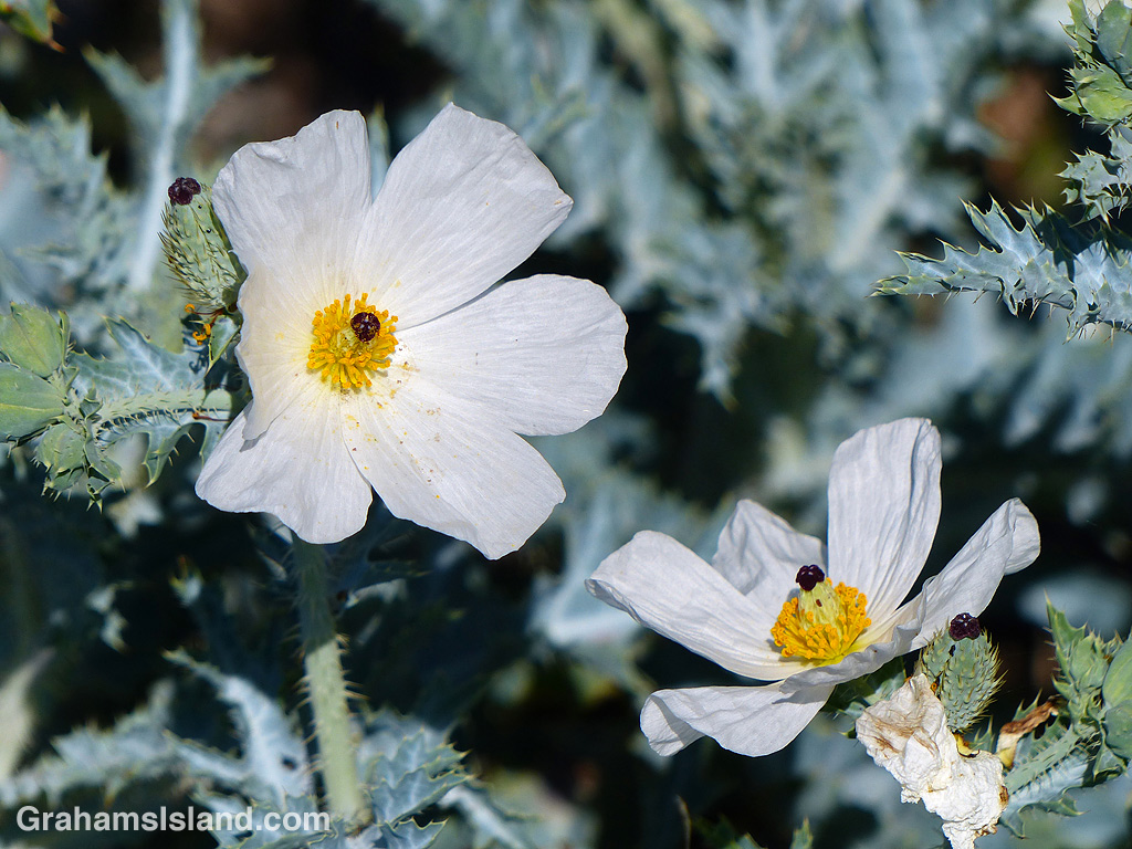 Argemone glauca is an endemic plant, known in Hawaii as Pua Kala or Hawaiian Prickly Poppy. It favors the hot, dry, and sunny conditions on the west side of the island and can grow anywhere from the coast, where these were, all the way up to subalpine areas of the volcanoes.