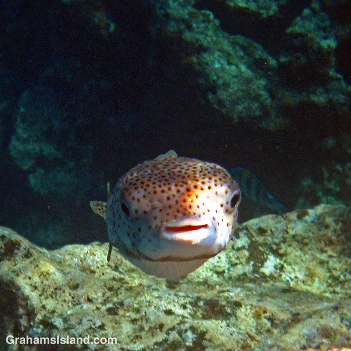 On a recent swim, a Giant Porcupinefish had claimed the spot and it rebuffed the approach of a smaller Giant Porcupinefish several times (top photo).
